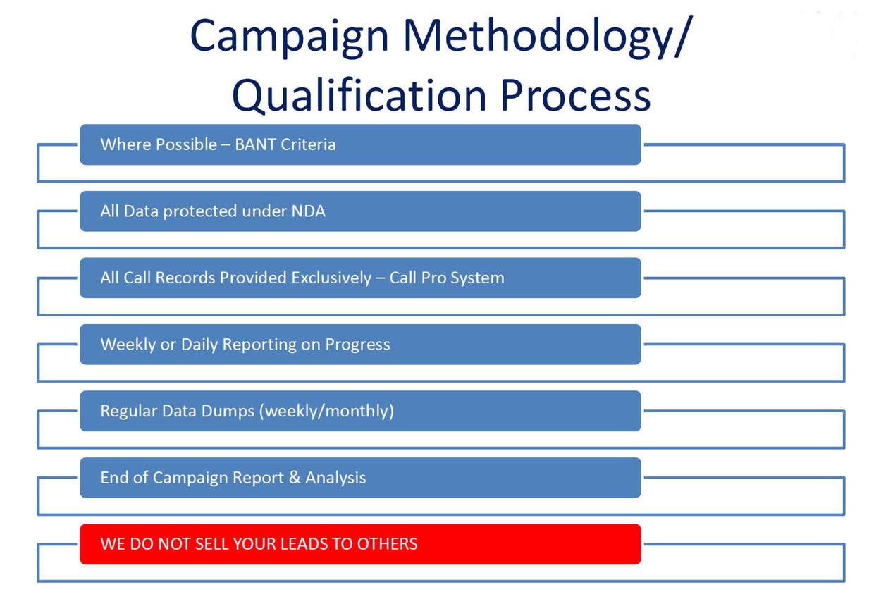 We, wherever possible, will qualify our leads to the BANT (Budget, Authority, Need, Timeframe) criteria, or a mutually agreed specific criteria of your choice.